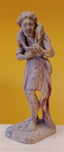 Lot 2269 | Scultura lignea raffigurante un pastore con pecora sulle spalle, tracce di poli
