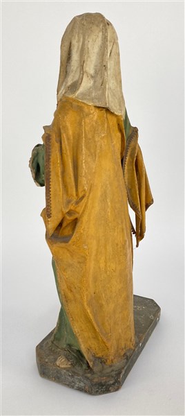 Arte dell'Italia meridionale, secolo XVIII. Scultura da presepe raffigurante donna velata con stola gialla, in cartapesta, poggiante su base squadrata in legno (h. cm 42) (difetti, rotture e mancanze)