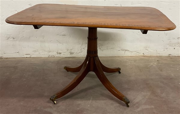 Tavolo con piano a vela filettato, fusto tornito su gambe sagomate desinenti a zampe ferine in bronzo con rotelle, Inghilterra fine secolo XIX (cm 123x73x98) (difetti)