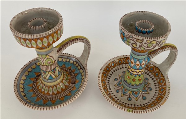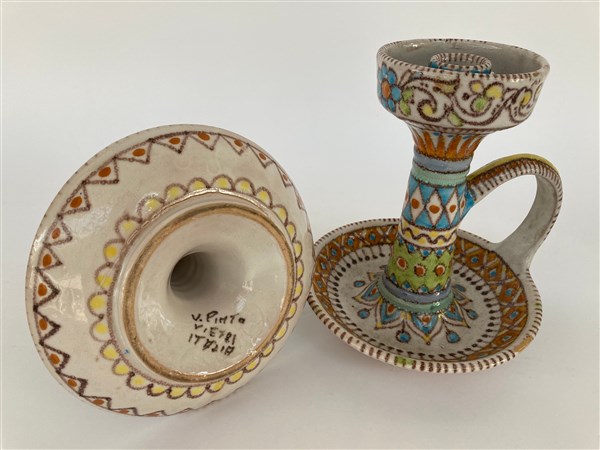 Manifattura di Vietri sul Mare, coppia di candelieri in ceramica dipinta in pol