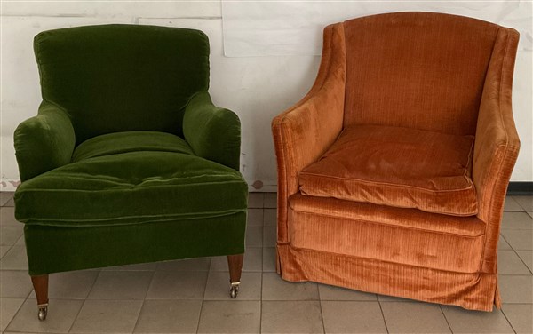 Lot 2305 | Lotto composto da due poltrone rivestite in velluto verde e mattone (difetti)