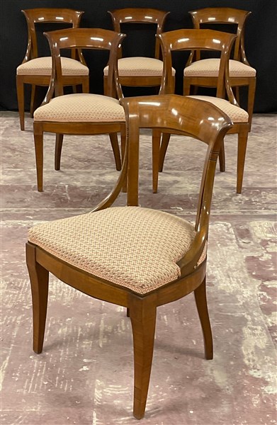 Gruppo di sei sedie a gondola in legno con schienale a giorno, seduta imbottita