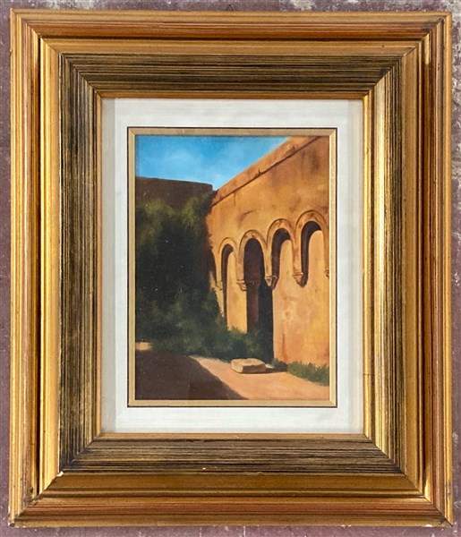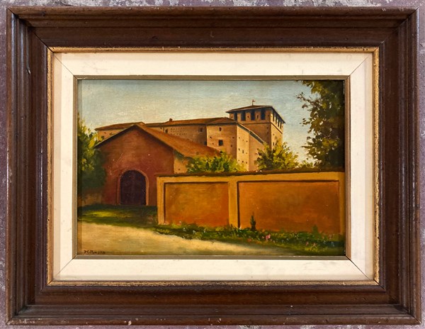 Lotto di due dipinti ad olio su compensato e tela raffiguranti scorci di edifici (cm 23x17 e cm 20x30), uno firmato e l'altro siglato al fronte, iscritti al retro