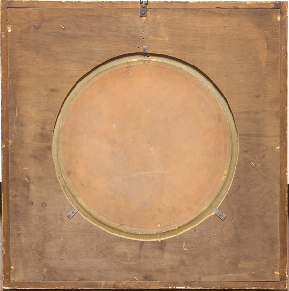 "Fanciulla con scialle" 1886, olio su piatto in terracotta (d cm 45) Firmato e datato in bsso a destra. Entro teca in cornice in legno intagliato e dorato