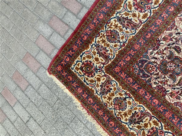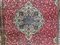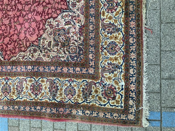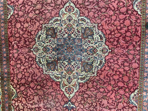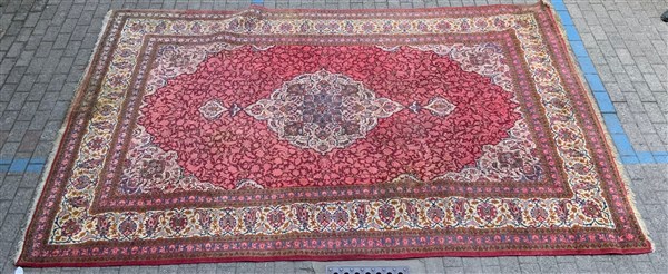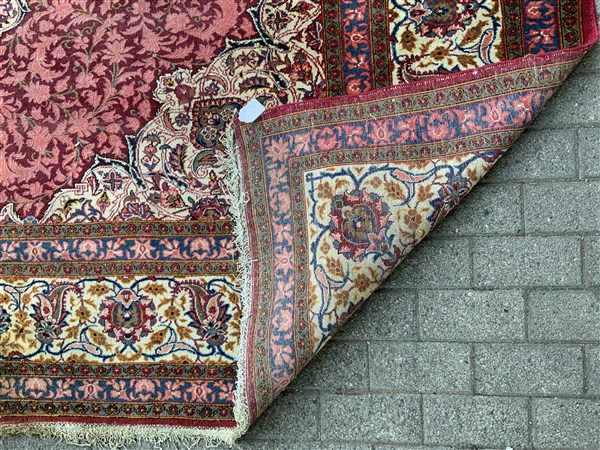 Tappeto Keshan, Persia, secolo XX. Decoro con medaglione con puntali su campo bordeaux decorato con motivo floreale all over nei toni del rosa e rosso. Bordura Herati a fondo bianco (cm 365x256) (difetti)