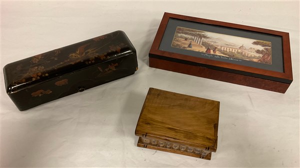 Lotto composto da una scatola orientale in lacca, una decorata con gouache con vedute di Napoli dal Vomero e una decorata a finti libri (difetti)