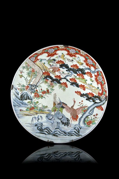 Piatto in porcellana policroma decorato a motivi di gru in paesaggi Giappone, s