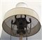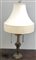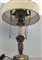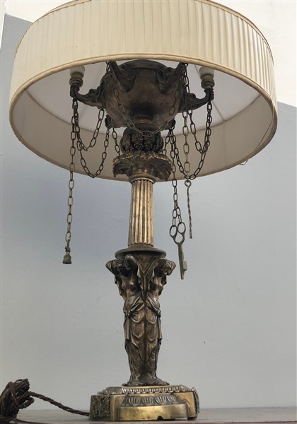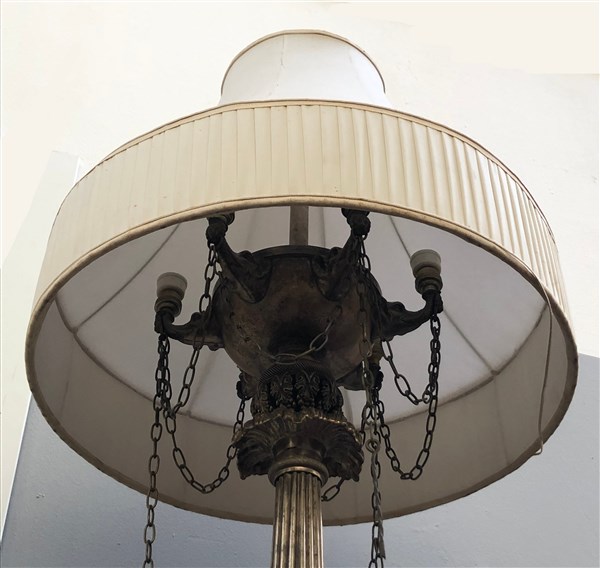 Lampada fiorentina con accessori in metallo argentato a sei fiamme con bracci a teste d'elefante. Sostegno cesellato e decorato a motivi vegetali, parte centrale a colonna scanalata sorretta da tre figure femminili. Base decorata a palmette e stemmi con aquile bicipiti. Paralume in stoffa sormontato da figura di colomba ad ali spiegate. Sec. XIX (difetti, rotture e mancanze)
