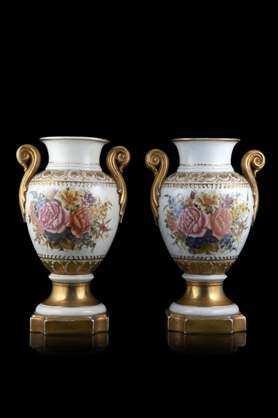 Coppia di vasi biansati in porcellana decorati in policromia e dorature e fiori e volute, basi sagomate. Secolo XIX (h. cm 25)