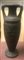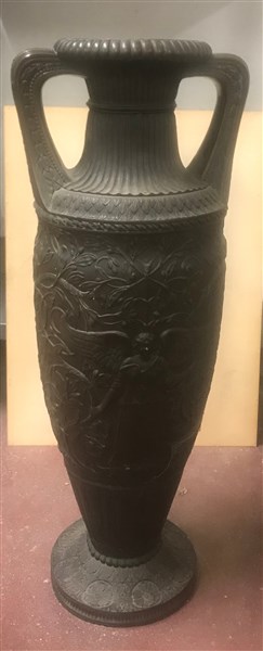 Vaso ad anfora biansato in metallo brunito, collo decorato a scanalature, corpo a girali di foglie e figure alate in rilievo (h cm 76) (difetti)