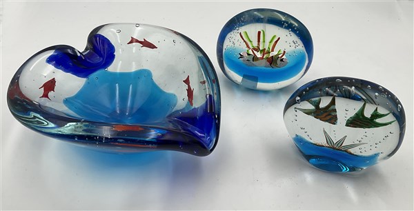 Lotto composto da due presse-papier in vetro sommerso raffiguranti acquari, di cui uno firmato Serenella sotto la base ed una ciotola in vetro sommerso decorata con pesci. Sec XX (misure diverse) (lievi difetti)