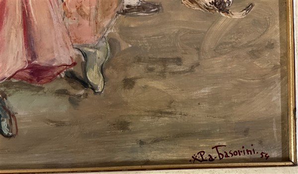 Pierangelo Basorini "Interno con figure" olio su compensato (cm 76x62) Firmato i