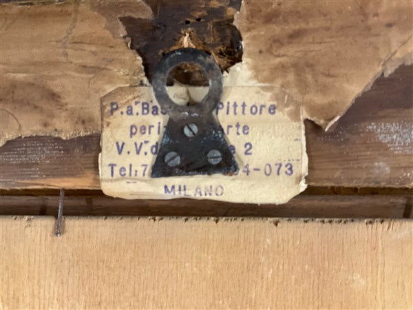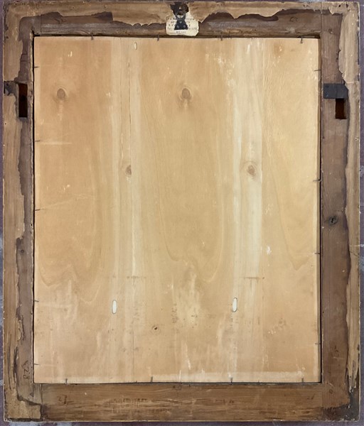 "Interno con figure" olio su compensato (cm 76x62) Firmato in basso a destra. Al retro: cartiglio dell'autore. In cornice
