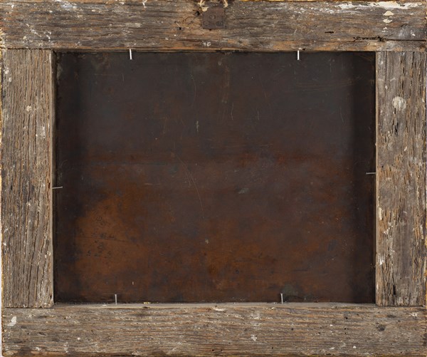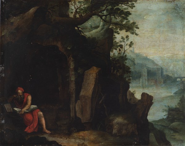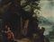 Scuola del nord Europa Paesaggio con San Girolamo Olio su rame, cm 26x33 In c