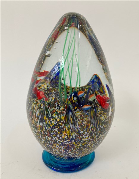 Scultura in vetro sommerso di forma ovoidale raffigurante un fondale marino (h