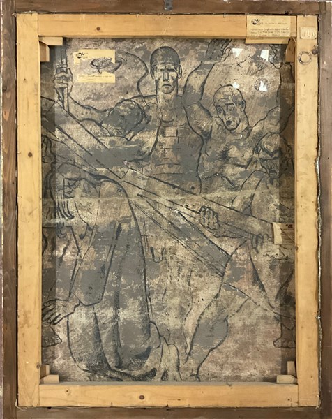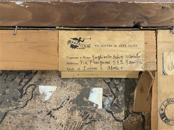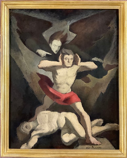 "Caino e Abele" olio su tela (cm 95x75) Firmato in basso a destra. Al retro: cartigli di cui uno espositivo e timbro; bozzetto preparatorio raffigurante "Cristo flagellato". In cornice