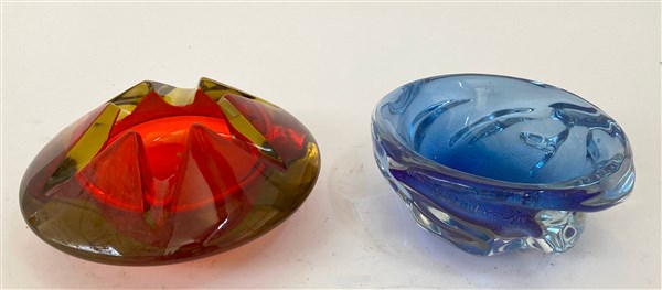 Lotto di due posacenere in vetro di forme, colori e misure differenti. (difetti)