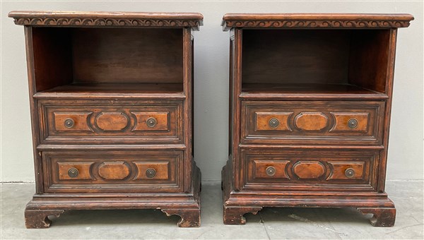 Coppia di comodini in legno intagliato con due cassetti, vano a giorno e piedi a mensola (cm 56x66x39) (difetti)