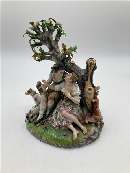 Manifattura del secolo XX. "Dopo la caccia" gruppo in porcellana policroma (h. cm 30) (difetti)