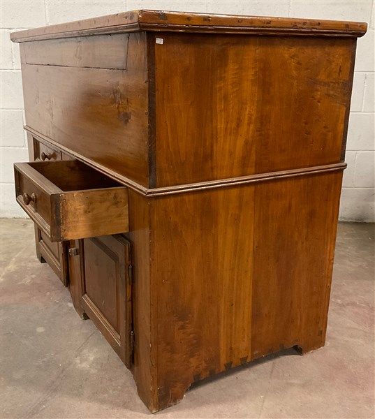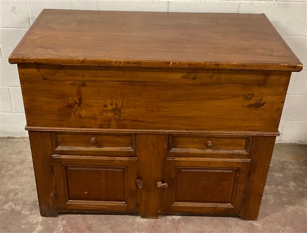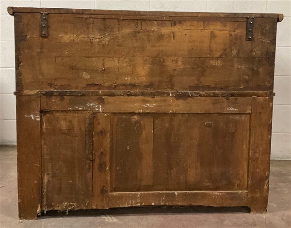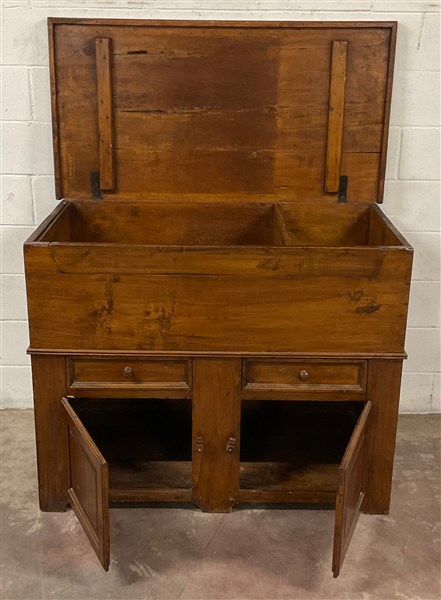 Madia in legno intagliato, fronte a due ante e due cassetti con coperchio celante vani (cm 125x99x65,5) (difetti)