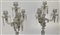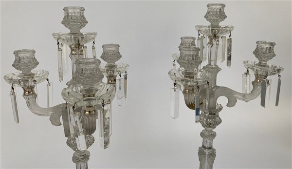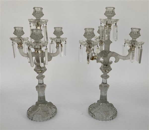 Coppia di candelabri a quattro fiamme in vetro con pendenti in cristallo sfaccettato (h. cm 48) (difetti e restauri)