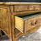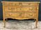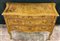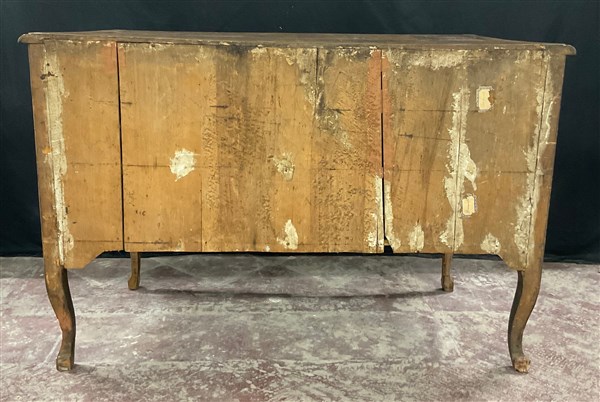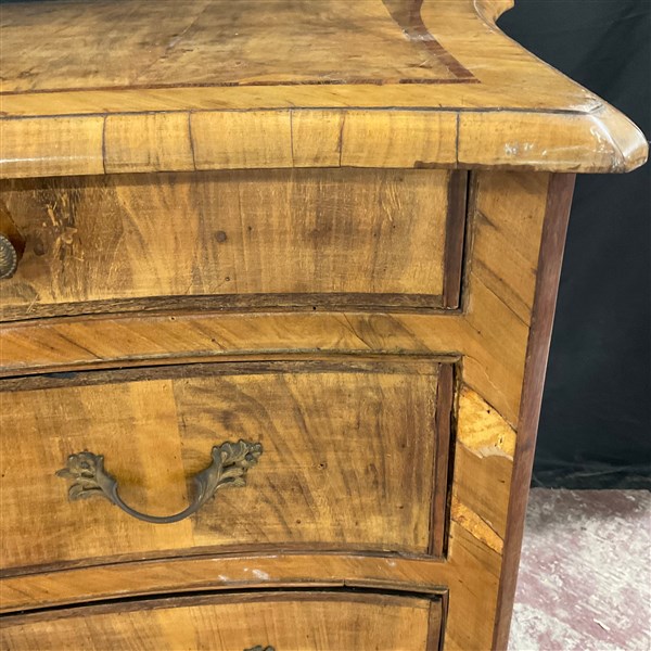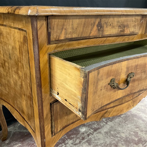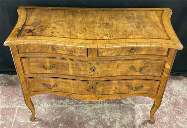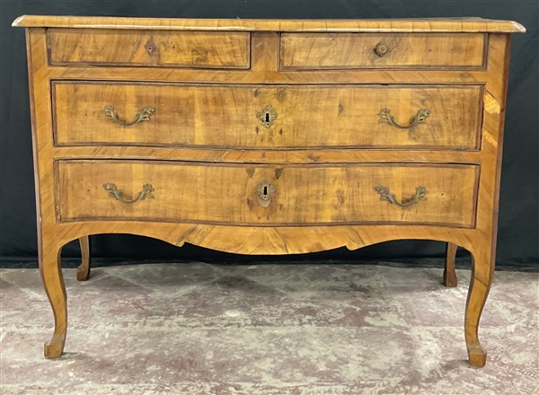 Comò in noce radicato e filetttato, mosso sul fronte e sui fianchi a due cassetti più due in linea sottopiano. Fascia, piano e gambe sagomate. Guarnizioni in metallo (cm 137x91x62) sec. XVIII (difetti e restauri)