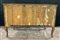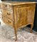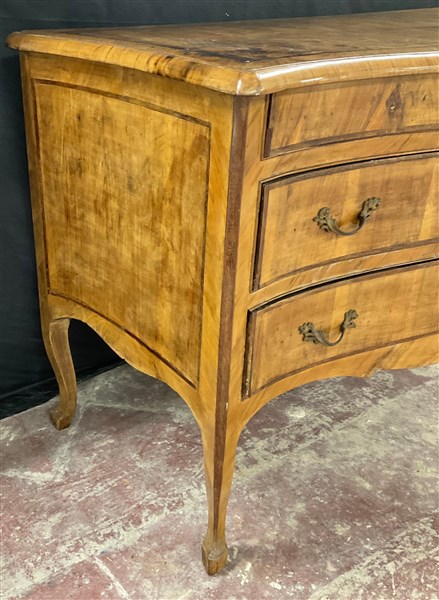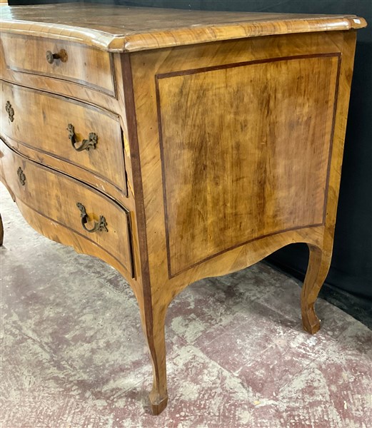 Comò in noce radicato e filetttato, mosso sul fronte e sui fianchi a due casset