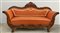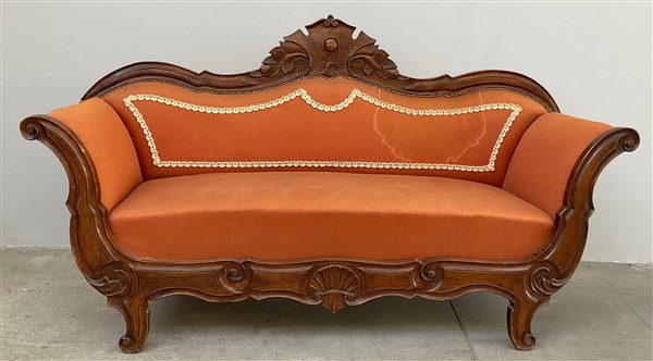 Divanetto a barca in noce con schienale e fascia sagomata ed intaglita a fregi e volute. Braccioli e piedi terminanti a ricciolo. Sec. XIX (difetti)