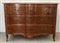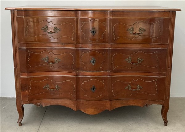 Comò in legno intagliato con fronte mosso a tre cassetti, fianchi pannellati, piedini e fascia sagomati (cm 243x104x65) (difetti)