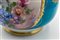 Manifattura di Limoges, vaso di forma circolare in porcellana dipinta in policromia nei toni dell'oro e azzurro, centrato da mazzi di fiori (cm 24x20x24) (difetti)