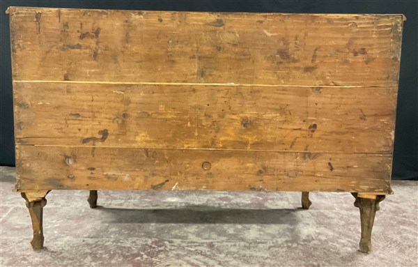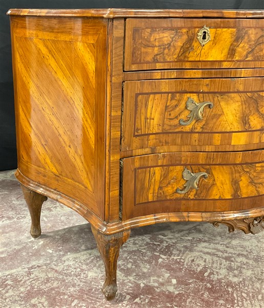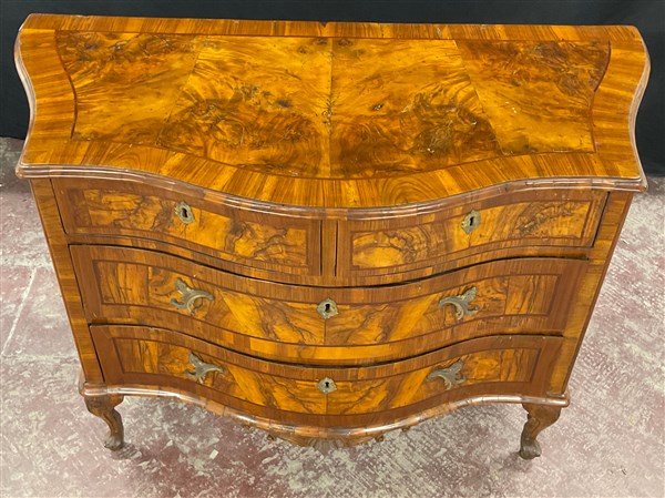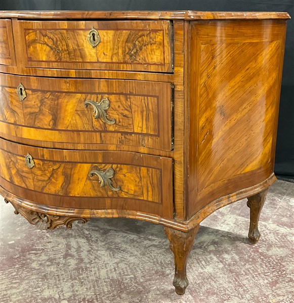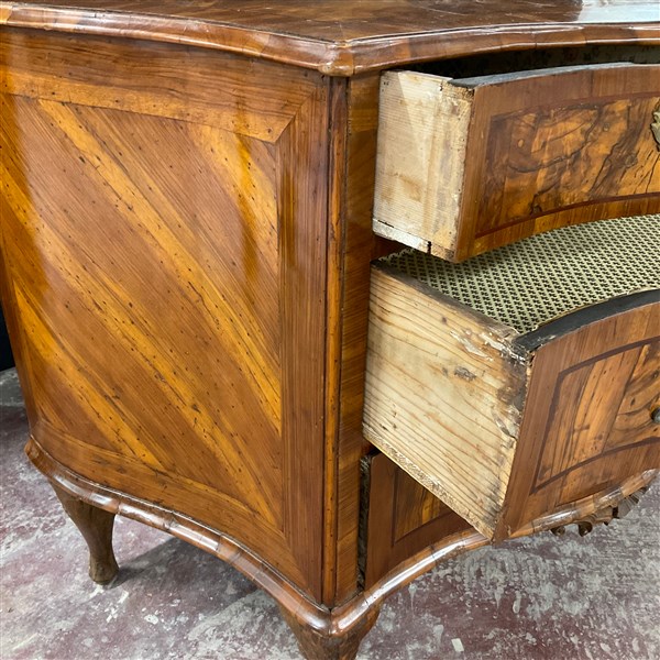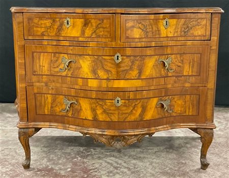 Comò lastronato, radicato e filetttato in legno vari a due cassetti più due in linea sottopiano. Fronte e fianchi mossi. Quattro piedini sagomati, sec. XVIII (cm 122x81x57) (difetti)
