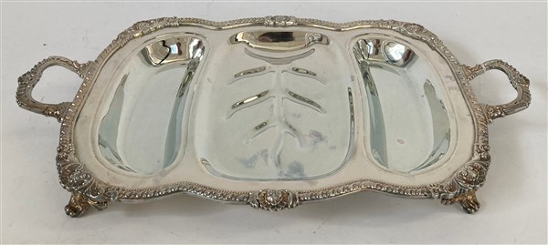 Vassoio per asparagi in metallo argentato con bordo sbalzato a volute, piedi a ricciolo (L. cm 60,5) (difetti)