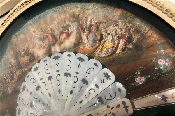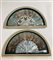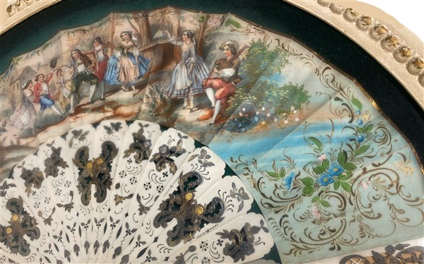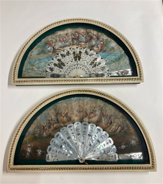 Lotto composto da due ventagli uno con stecche in madreperla e l'altro in madreperla e osso; pagine decorate a festa di villaggio e scena orientalista. Entro teche in legno intagliato e vetro (cm 58,3x33,5) (difetti)