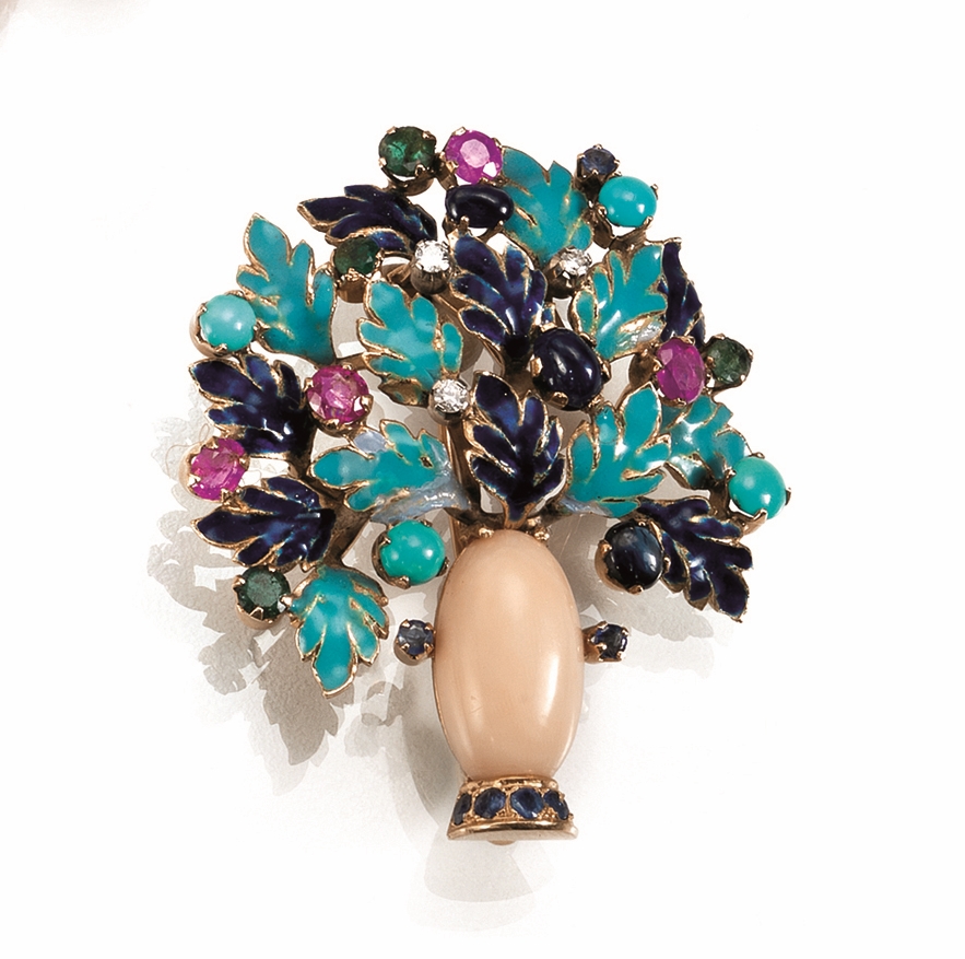 modellata come un vaso di fiori e foglie, il vaso realizzato con un corallo ovale cabochon, le foglie decorate in smalti blu e turchesi, i fiori in piccoli rubini, smeraldi, brillanti, turchesi e zaffiri sfaccettati e cabochon, g 28, lievi consunzioni allo smalto