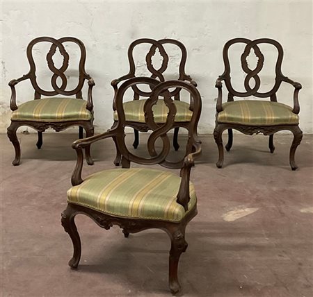 Gruppo di quattro poltroncine di forma mossa in legno intagliato a fregi e motivi vegetali con schienale a giorno e fascie incrociate, gambe sagomate. Venetto sec. XVIII (difetti)