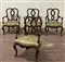 Gruppo di quattro poltroncine di forma mossa in legno intagliato a fregi e moti
