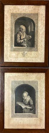 Coppia di acqueforti raffiguranti lettrice e filatrice (cm 50x40) in cornice (d