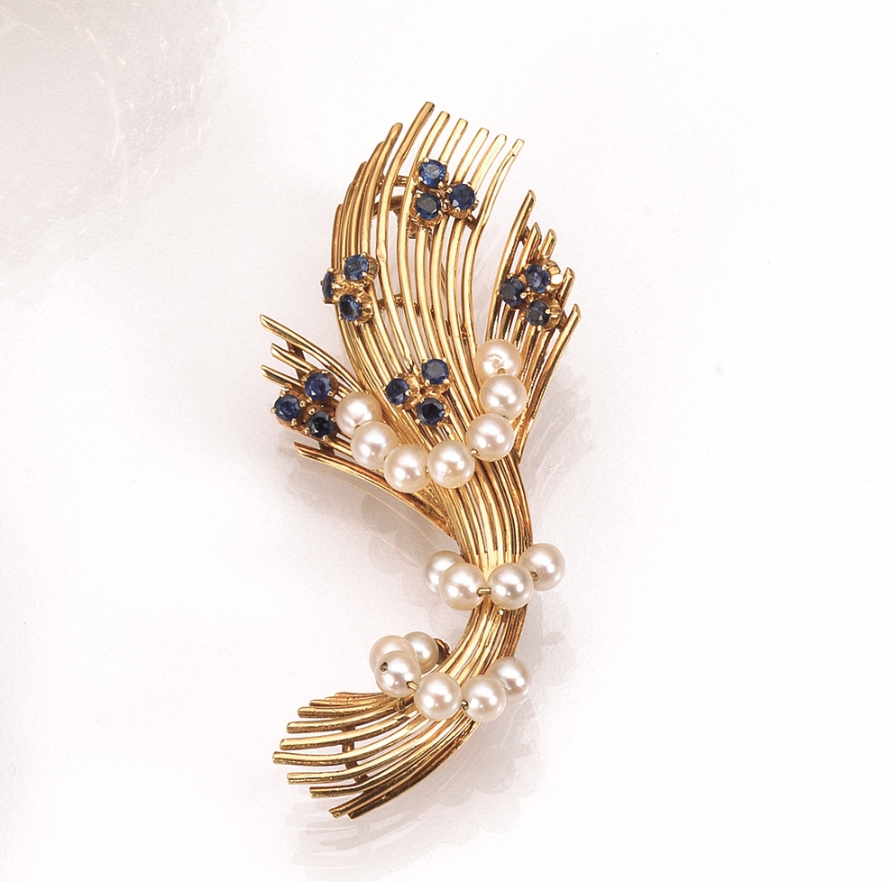 Spilla, anni '60, in oro giallo, zaffiri e perlemodellata come un fascio di...