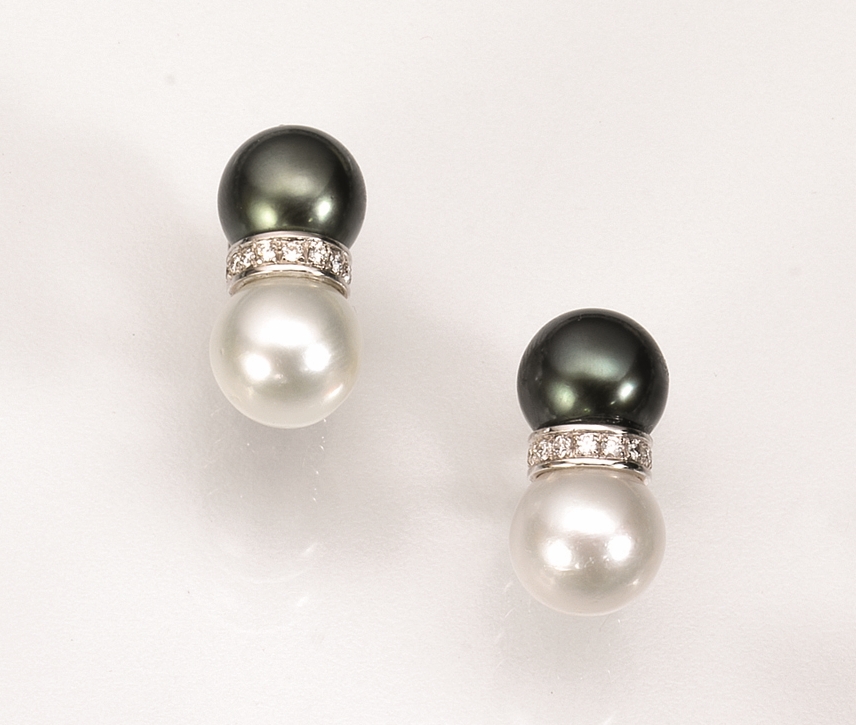 Paio di orecchini in oro bianco, diamanti e perle Tahiti e South Sea