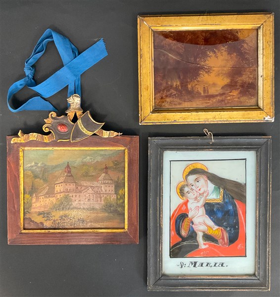 Lotto composto da tre dipinti di cui due verre peint e un olio su tela con soggetti e misure differenti (difetti)