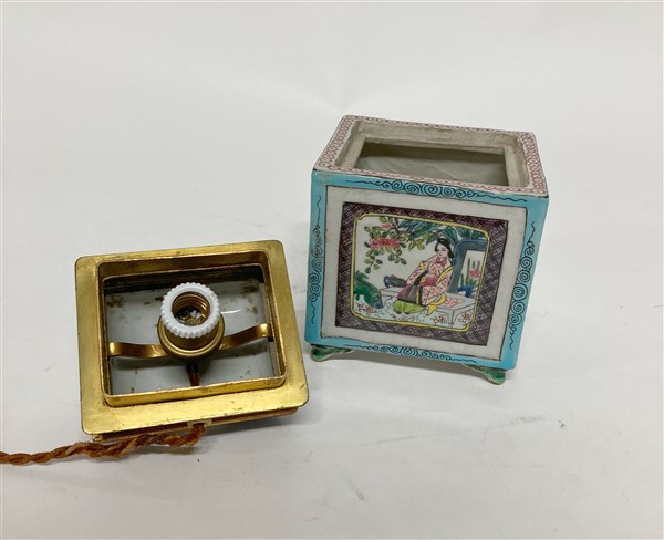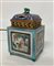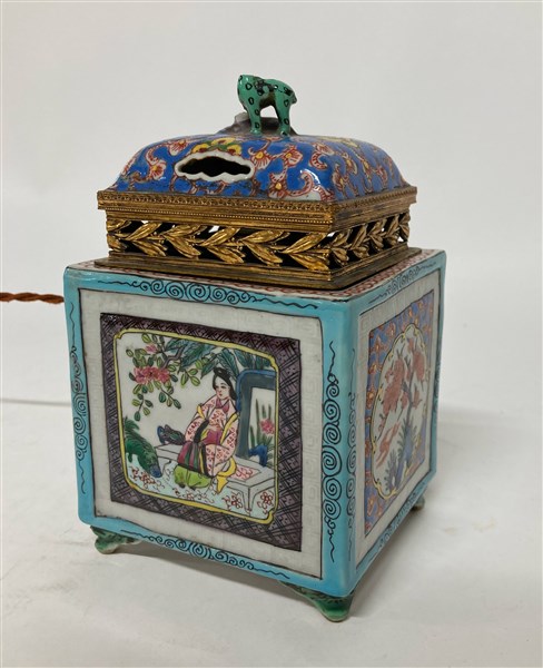 Lanterna in porcellana policroma decorata a figure e motivi vegetali, presa del coperchio ad animali a tutto tondo, poggiante su quattro piedini a volute. Manifattura orientale, secolo XX (cm 10,5x16x9,9) (mancanze)