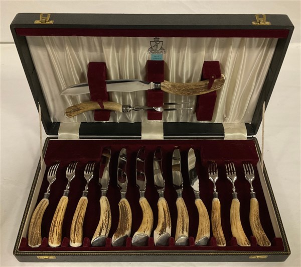 Set da arrosto in corno e acciao marcato "Samuel Peace" in custodia originale