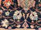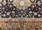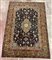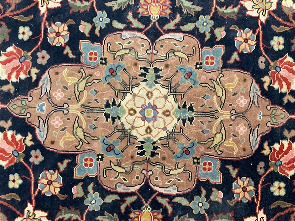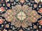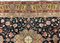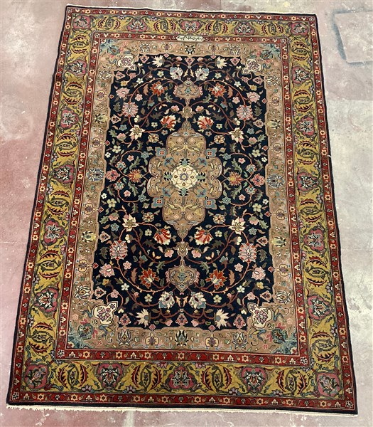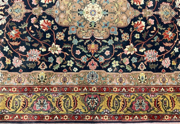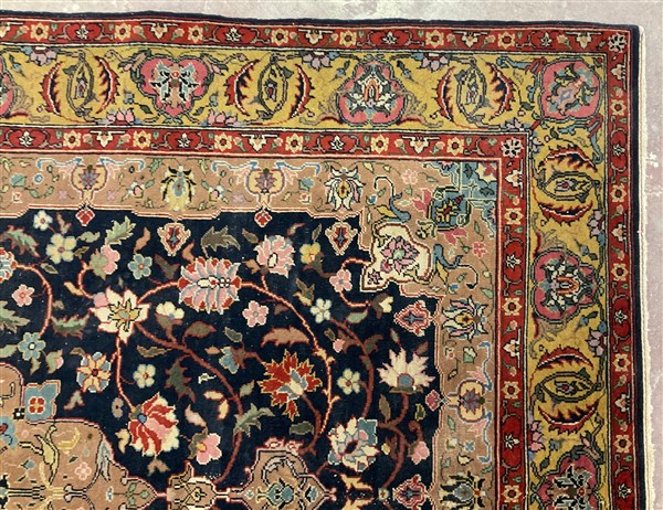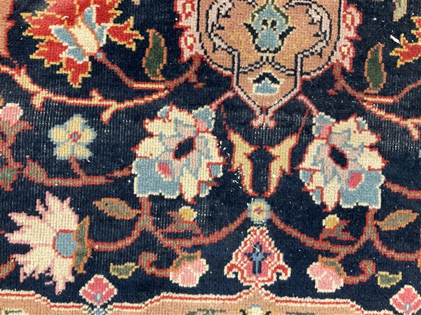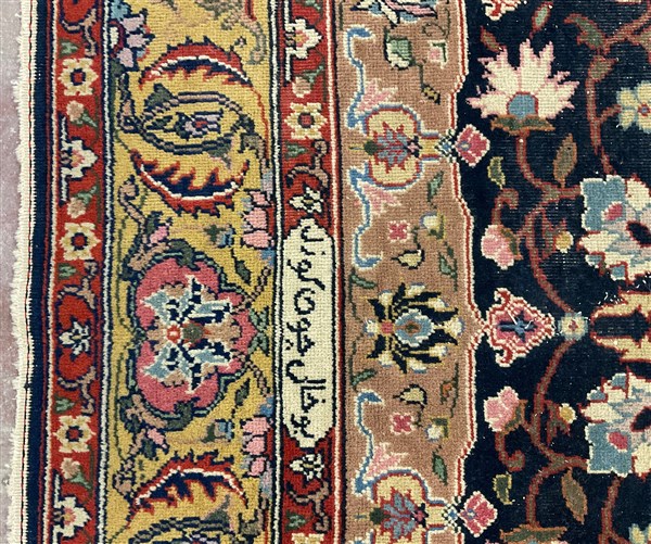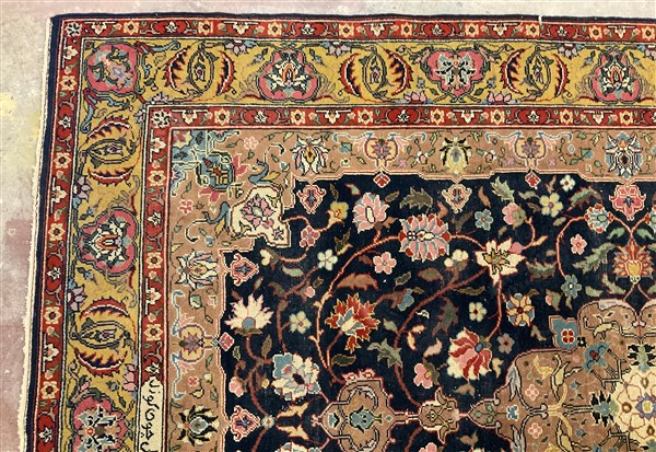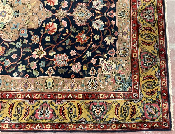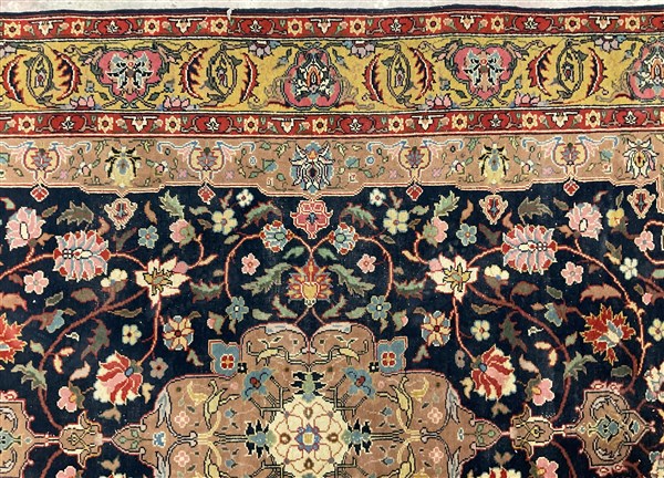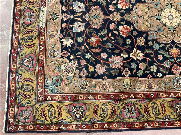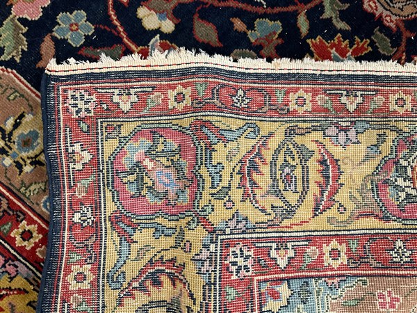 Tappeto romeno, secolo XX. Decoro con medaglione con puntali color nocciola su fondo blu notte cosparso di rami fioriti. Bordura Herati a fondo giallo. Un cartiglio con iscrizione islamica ad una testata (cm 272x188) (difetti e rapature)