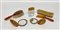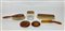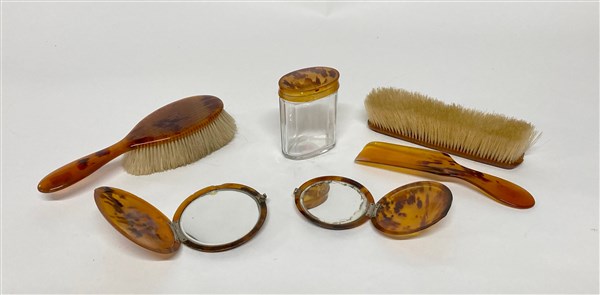 Set da toilette in bachelite a finta tartaruga composto da due spazzole, due specchi circolari da borsa, un contenitore in vetro e un calzascarpe (difetti)