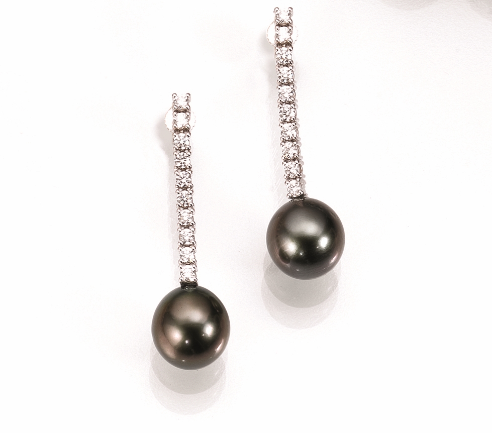 Paio di orecchini pendenti in oro bianco, perle Tahiti e diamanti