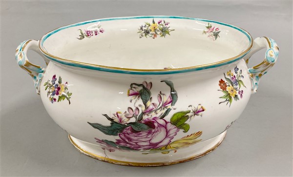 Manifattura inglese, secolo XIX. Grande rinfrescatoio biansato in porcellana decorato in policromia a mazzi fioriti, anse decorate a volute con dettagli dorati. Marcato English porcelain alla base (cm 49x21x33) (difetti)