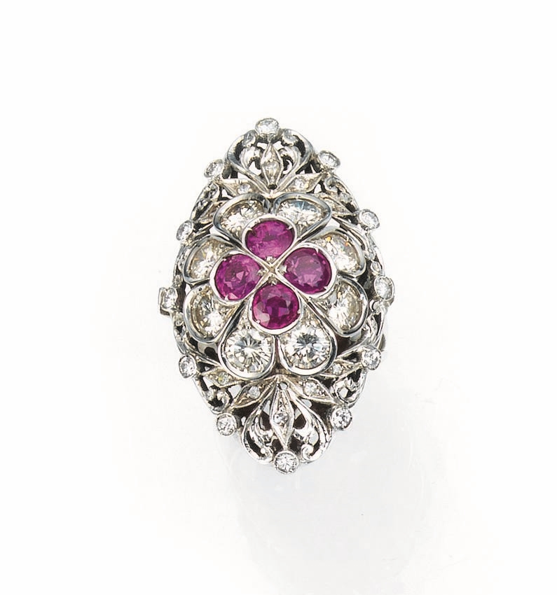 realizzato come una losanga in oro traforato a volute impreziosite da piccoli brillanti e centrata da una corolla formata da otto petali esterni in brillanti per ct 3,50 e quattro petali in rubini, g 14