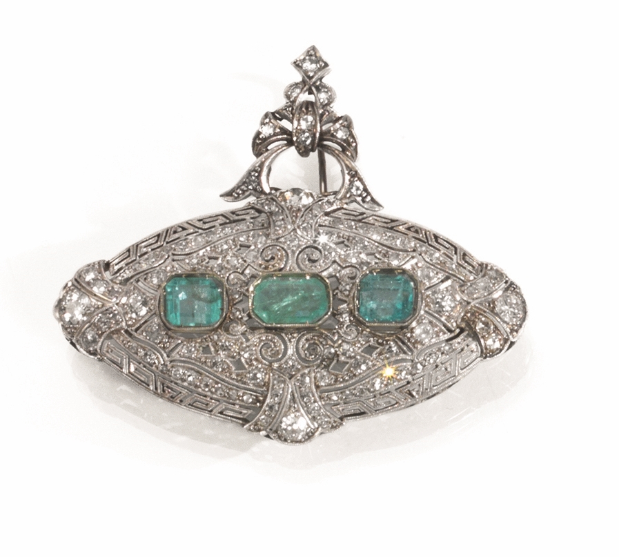 realizzata come uno scudo ovale traforato a volute e decorato da piccoli brillanti di taglio vecchio, al centro tre smeraldi ottagonali, con appiccagnolo per il pendente analogamente decorato, g 17