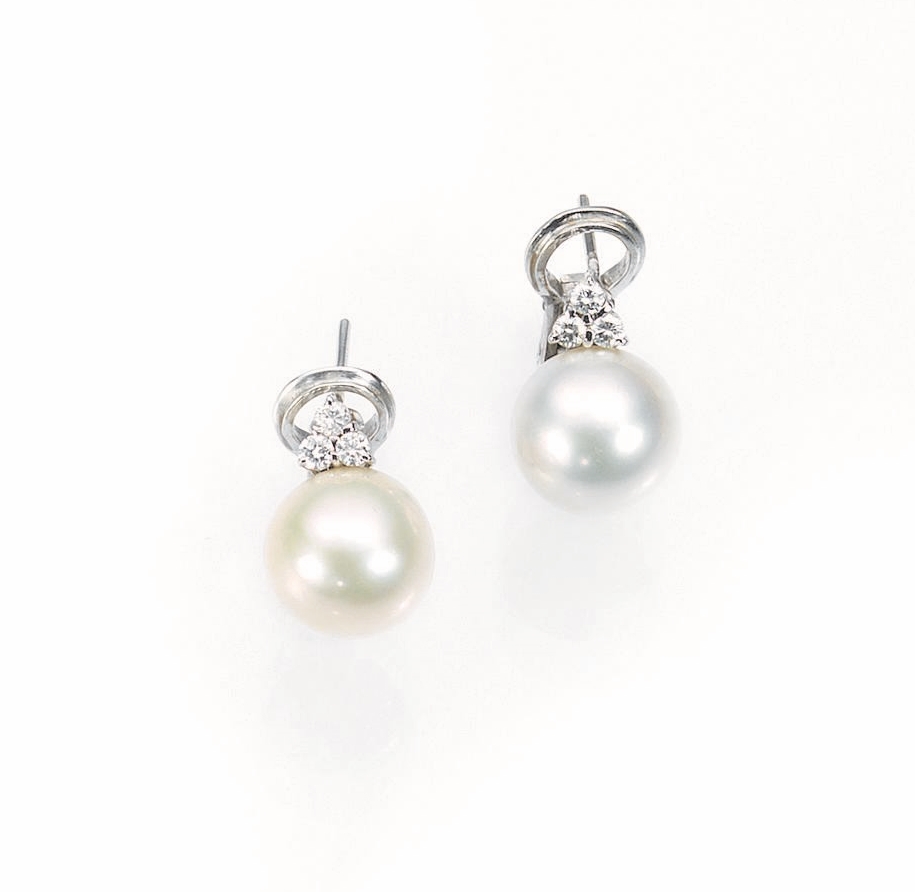 ciascuno realizzato con una perla diam. mm 12, sormontata da un motivo a trifoglio in brillanti, g 12