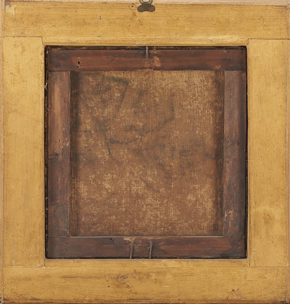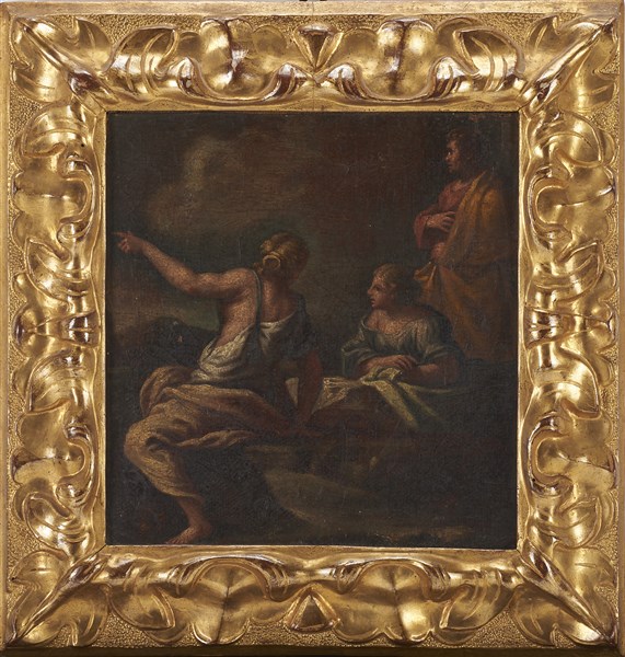 Scuola della fine del secolo XVII. Figure in paesaggio. Olio su tela (cm 21x20,5) in cornice in legno intagliato e dorato al retro F. Mazzola d i Parmigianino